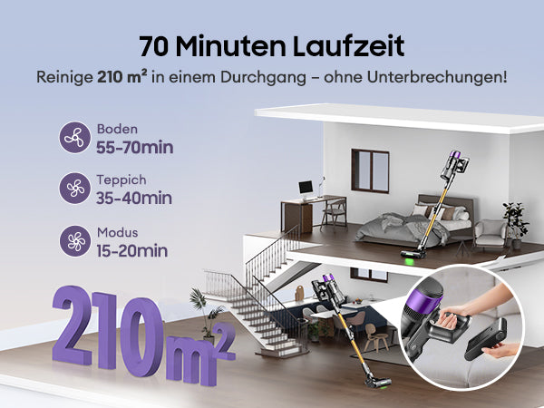 Reinige 210 m² in einem Durchgang – ohne Unterbrechungen! Dank unserer fortschrittlichen Technologie profitieren Sie von optimaler Effizienz und erheblichem Zeitgewinn. Verwandeln Sie Ihre Reinigungsroutine und erzielen Sie makellose Ergebnisse zu Hause oder im Büro.